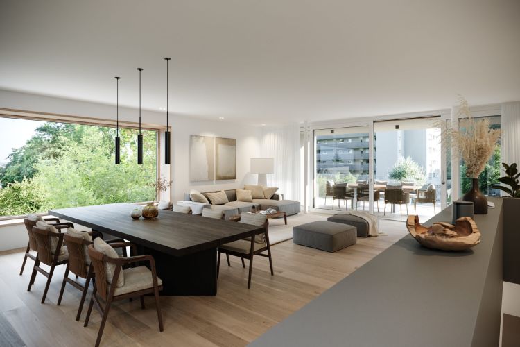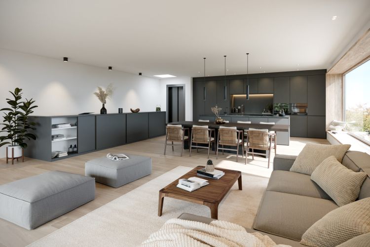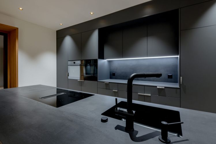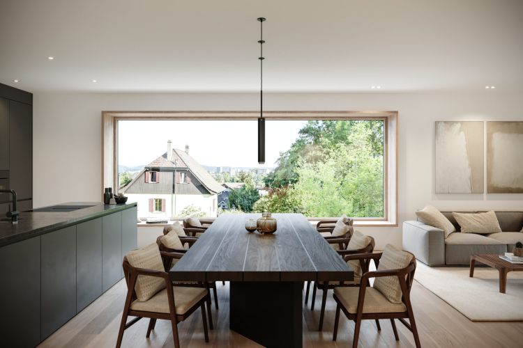 Der gesamte Innenausbau baut auf massivem Eichen-Parkettboden auf und korrespondiert optimal mit dessen hellbraunem Farbton. In der 5 Meter langen, massangefertigten Küche, ausgestattet mit hochwertigen Einbaugeräten und ergänzt durch eine grosse Kochinsel mit Keramikabdeckung und flächenbündigem Induktions-Kochfeld, werden Sie kulinarische Highlights landen! Hinter den Hochschränken verbirgt sich ein grosses Reduit mit wertvollem Stauraum.