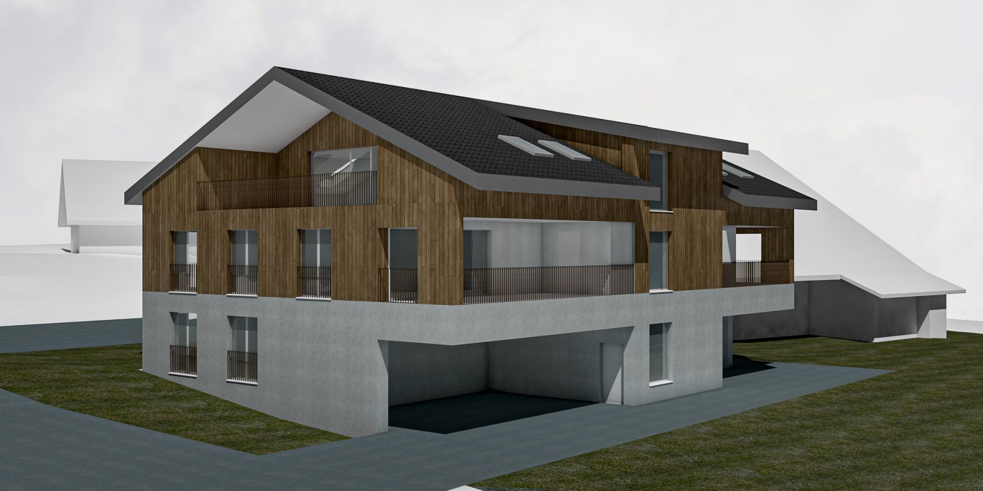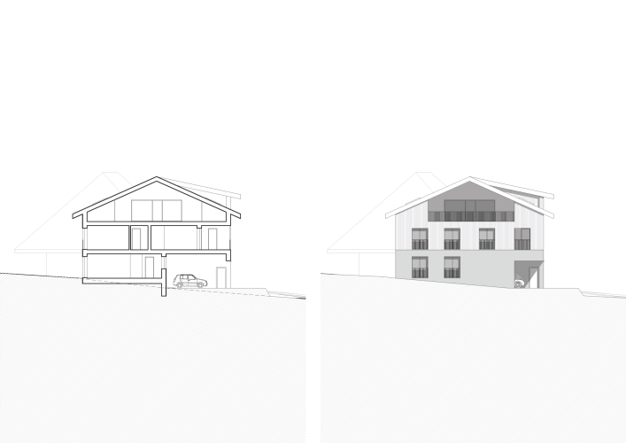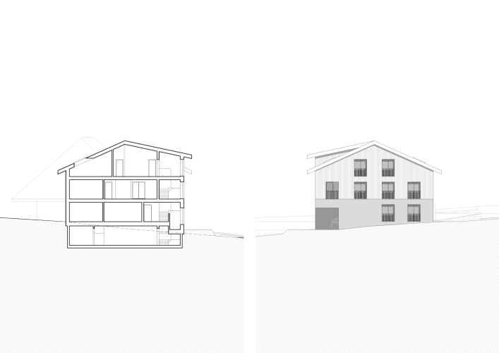 Die klar strukturierte Volumetrie mit traditionellem Steildach integriert sich harmonisch ins gewachsene Ortsbild. Der massive Sichtbetonsockel bildet das Fundament des Gebäudes, darüber gliedert sich das Ober- und Dachgeschoss in feiner vertikaler Holzschalung. Das zentrale Treppenhaus wird als eigenständiges Volumen lesbar und schafft eine klare Adresse.
