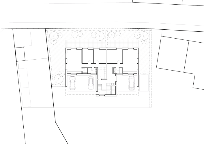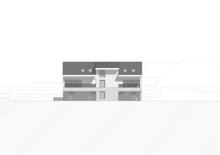 Die Erschliessung erfolgt durch das zentrale Treppenhaus, mit gedeckter und überhohoer Parkierung im Erdgeschoss auf der rückwärtigen Seite. Die Erdgeschosswohnungen verfügen über direkte Gartenzugänge zur grünen Dorfstrasse hin, während die Wohnungen im Obergeschoss mit Balkonen den südöstlichen Grünraum aufspannen. Die Dachwohnung bietet mit einer grosszügigen Loggia nach Süden ein besonderes Wohnerlebnis. Durch die differenziert angeordneten Aussenräume hat jede Wohnung ihre individuelle Privatsphäre.