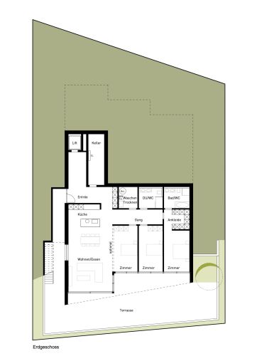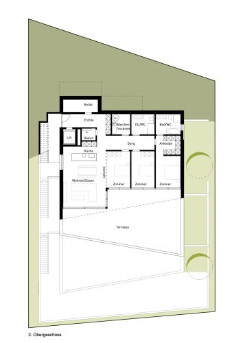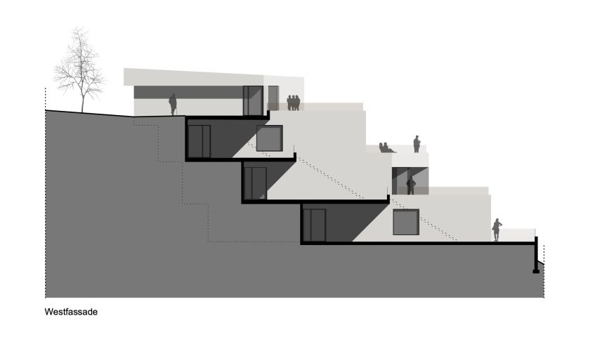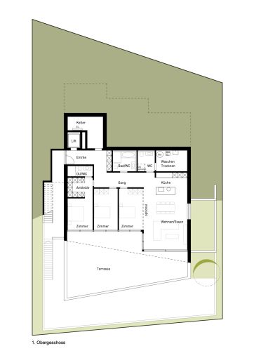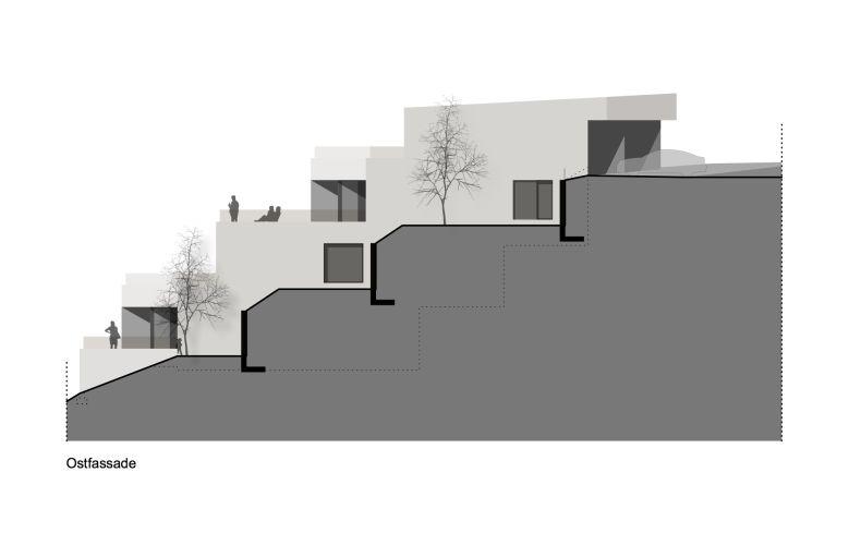 An bester Lage, mit traumhaftem Ausblick auf die Aarelandschaft und die Stadt Aarau, thront das Terrassenhaus mit drei Wohneinheiten. Der Baukörper ist sorgfältig in die steile Topografie eingepasst und belässt das natürlich gewachsene Terrain unverändert. Die Wohneinheiten werden durch einen Innenlift direkt vom Garagengeschoss her erschlossen. Sämtliche Wohnräume werden wechselseitig angeordnet, nach Süden ausgerichtet und geschützt mittels Vordächer. Durch raumhohe Fensterfronten werden sie optimal belichtet. Der grossflächige, partiell überdachte Terrassenbereich bietet jeder Wohneinheit ihren ganz privaten Bereich mit viel Ambiente. Rückwärtig sind die Nass- und Nebenräume anberaumt, diese werden durch eine breite und gut ausgeleuchtete Korridor-Zone erschlossen.