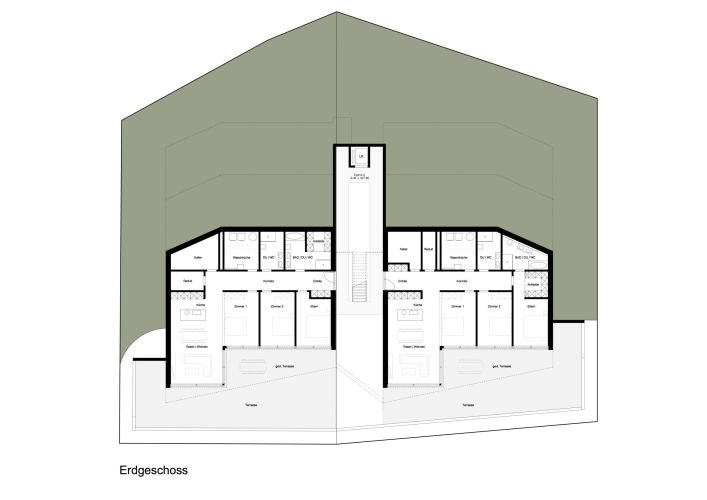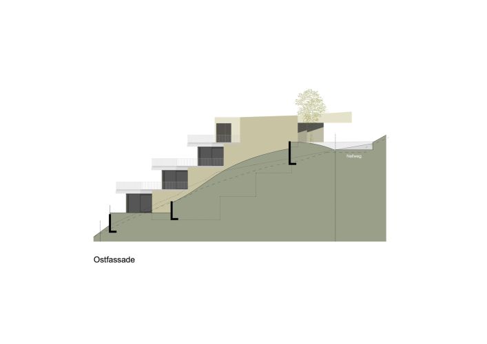 An bester Lage, mit traumhaftem Ausblick auf die Aarelandschaft und die Stadt Aarau, thront das Terrassenhaus mit 6 Wohneinheiten. Der Baukörper ist sorgfältig in die steile Topografie eingepasst und belässt das natürlich gewachsene Terrain unverändert. Die Wohneinheiten werden durch einen Aussenlift direkt vom Garagengeschoss her erschlossen. Sämtliche Wohnräume werden wechselseitig angeordnet, nach Süden ausgerichtet und geschützt mittels Vordächer. Durch raumhohe Fensterfronten werden sie optimal belichtet. Der grossflächige, partiell überdachte Terrassenbereich bietet jeder Wohneinheit ihren ganz privaten Bereich mit viel Ambiente. Rückwärtig sind die Nass- und Nebenräume anberaumt, diese werden durch eine breite und gut ausgeleuchtete Korridor-Zone erschlossen.