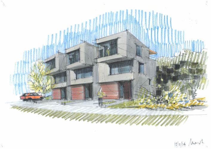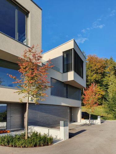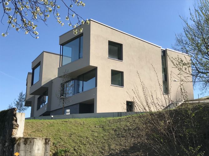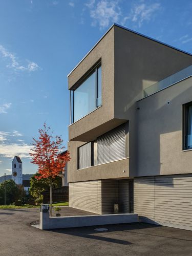 Die drei gestaffelten Gebäudekörper am östlichen Hang des Suhrerkopfes, folgen mit deren fächerartigen Grundrissen subtil der Geländekante und bieten den Innenräumen eine optimale Aussicht auf das Dorf, den Jura und bis hin zum Heitersberg. Der Aufbau des Gebäudeschnitts, mit den quer zum Hang verlaufenden Attikageschossen, folgt dem Geländeverlauf und staffelt das Gebäude in der dorfseitigen Ansicht. Die im Erdton gehaltene Farbgebung der Fassaden, bewirkt ebenfalls eine gute Einpassung ins Bild der prominenten Lage an der Bauzonengrenze des Suhrerkopfes.