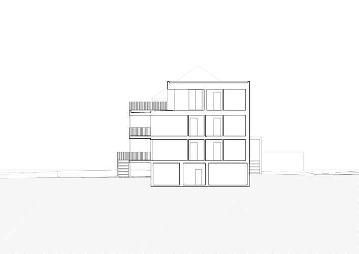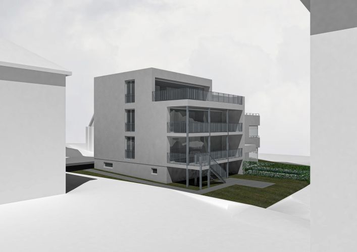 Das Mehrfamilienhaus umfasst drei hochwertige Wohneinheiten, die über ein gemeinsames Treppenhaus erschlossen werden. Die weitläufigen Balkone sind nach Westen ausgerichtet und bieten den Bewohnern einen ungestörten Blick in die Umgebung.